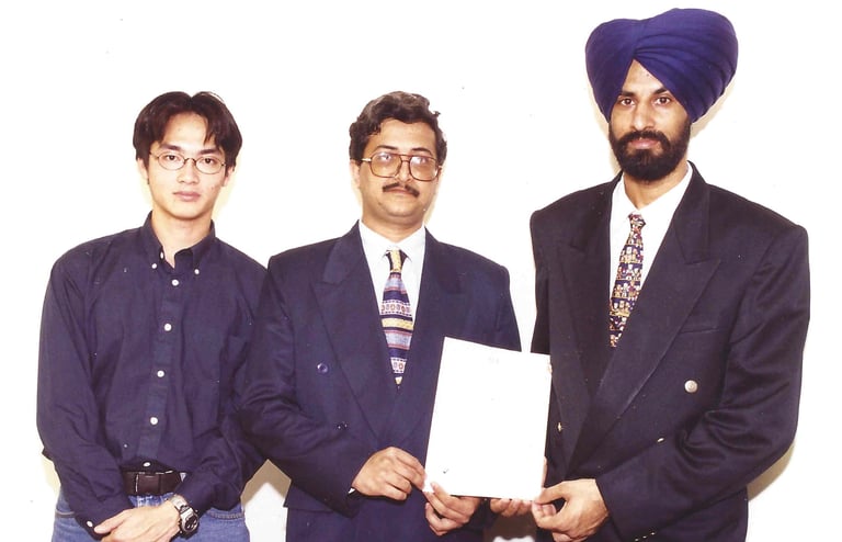 [ Photo: ISO 9001 achieved 1997 — Nilesh Dattani with Simon Tse and Kulwant Singh Uppal ]